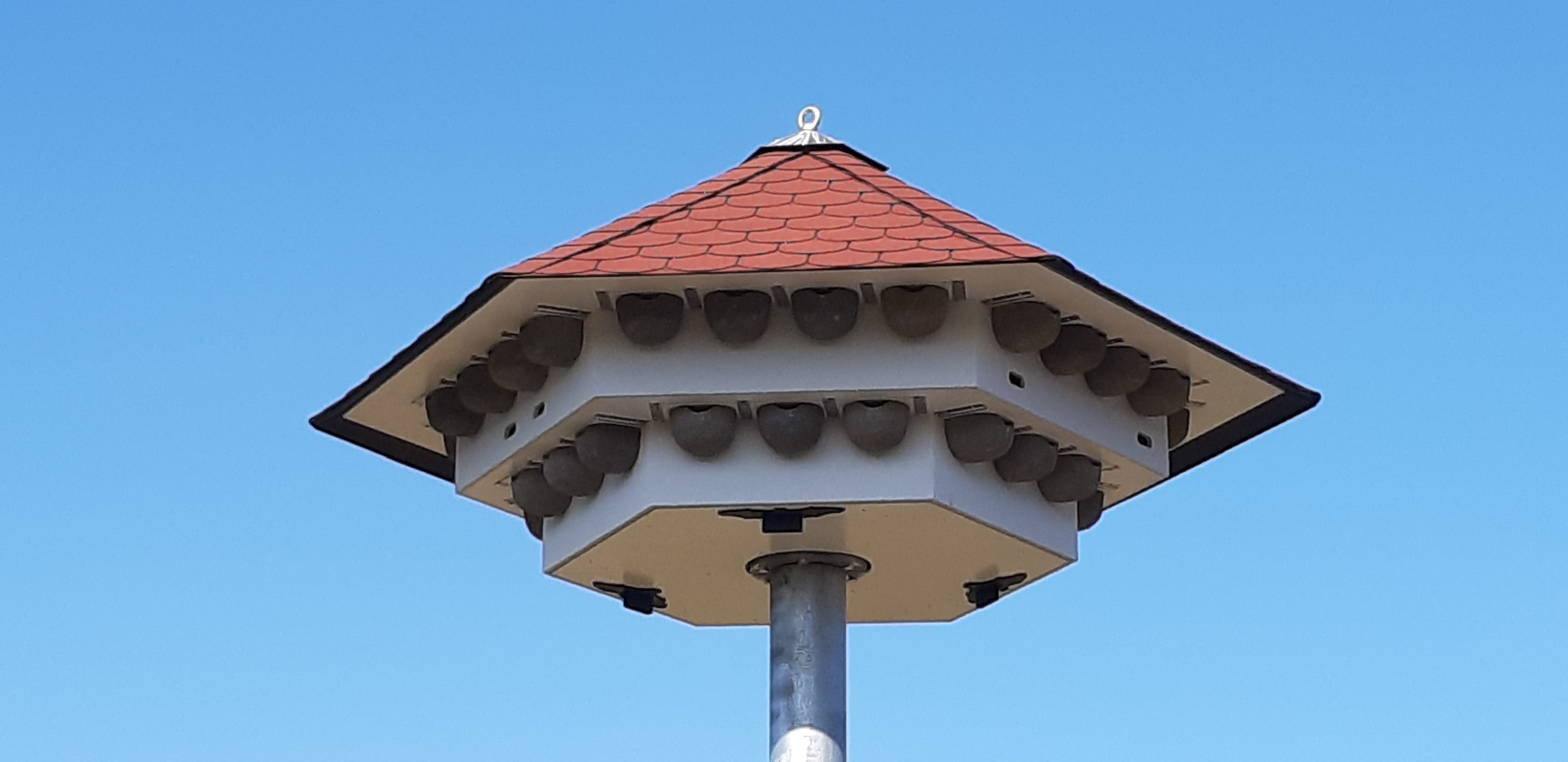 Schwalbenhaus Modell 42 (secheseckig): Bis zu 42 Mehlschwalbennester. Quartieren für Fledermäuse (Spaltenquartiere, isolierte und nicht isolierte Ganzjahresquartiere) sowie Kästen für Höhlenbrüter (Mauersegler, Stare, Sperlinge, Meisen, etc.) können im Dachraum integiert werden.
